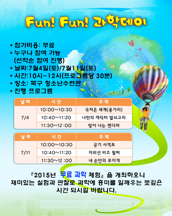 2015³âµµ ¹«·á°úÇÐüÇè -  Àç¹ÌÀÖ´Â ½ÇÇè°ú °üÂû·Î °úÇп¡ Èï¹Ì¸¦ Àϱú¿ì´Â ¶æ±íÀº ½Ã°£À» ¸¶·ÃÄÚÀÚ Âü°¡ÀÚ¸¦ ¼±Âø¼øÀ¸·Î ¸ðÁýÇÕ´Ï´Ù.